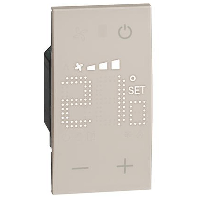 Thermostat Bticino Living Now color Sand, 2 modules, with backlit display for temperature control of a single zone. It is equipped with an input for the connection of a contact line (e.g. window contact). Functioning only with home automation systems.