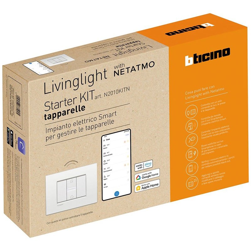 The Bticino LivingLight N2010KITN with Netatmo Smart Roller Shutter Starter Kit is the ideal solution for smart and automated management of 5 electric roller shutters. Thanks to compatibility with Alexa, Google Home and Apple HomeKit, you can control the shutters locally, remotely via smartphone or with voice commands.