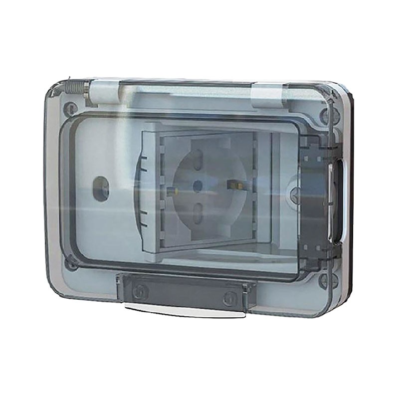 Housing 4Box WIDE with Schuko socket, White color, with hinged door, with protection degree IP55 also with plug inserted and door closed. Compatible with Vimar Plana, Gewiss Chorus.