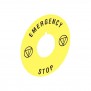 Lovato emergency disc for mushroom buttons, plastic, diameter 60mm, with EMERGENCY/STOP inscription.