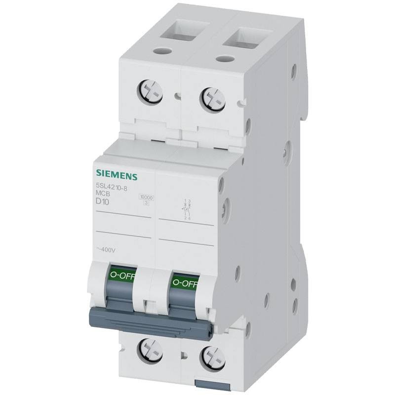 Siemens Circuit Breaker 5SL42108 2 poles 10A curve D, breaking capacity 10 kA. Ideal for circuits with high inrush currents such as motors, pumps, and transformers.