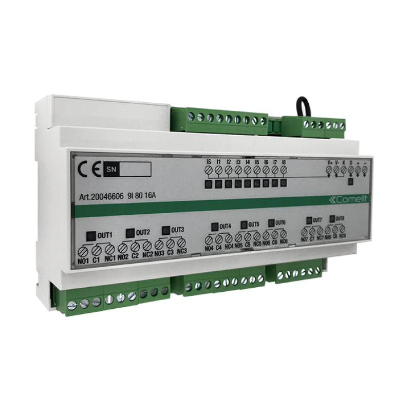 SimpleHome module 9 opto-isolated inputs (8 normal + 1 scenario) that can be used to connect pushbuttons near the switchboard and 8 relay outputs with NC/NO changeover contact to control resistive-type electrical loads up to 16A, dimensions 160x90x58mm (9 DIN modules). Maximum current consumption 220mA.