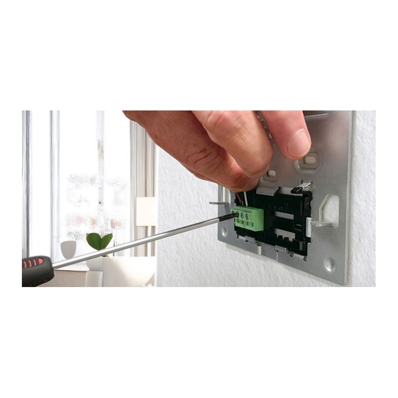 It is equipped with 6 mechanical buttons on the front with icons identifying its factory-set function. 3 buttons are backlit for easy operation: green color for "phonic socket" function, red color for "end communication" function, and white color for "electric lock" function. 3 pushbuttons are programmable and already configured to call the concierge switchboard, control an actuator, and perform auto switch-on. The center buttons in each row are equipped with tactile guides for the blind. On the right side of the video intercom, on the other hand, there are buttons to activate the Silent mode with a red indicator light and corresponding icon, and buttons to access the menu to adjust brightness, contrast, color and ringer volume values. As standard, it is equipped with out-of-door call that can also be programmed for other functions. Dimensions (W x H x D): 135 x 170 x 23 mm.