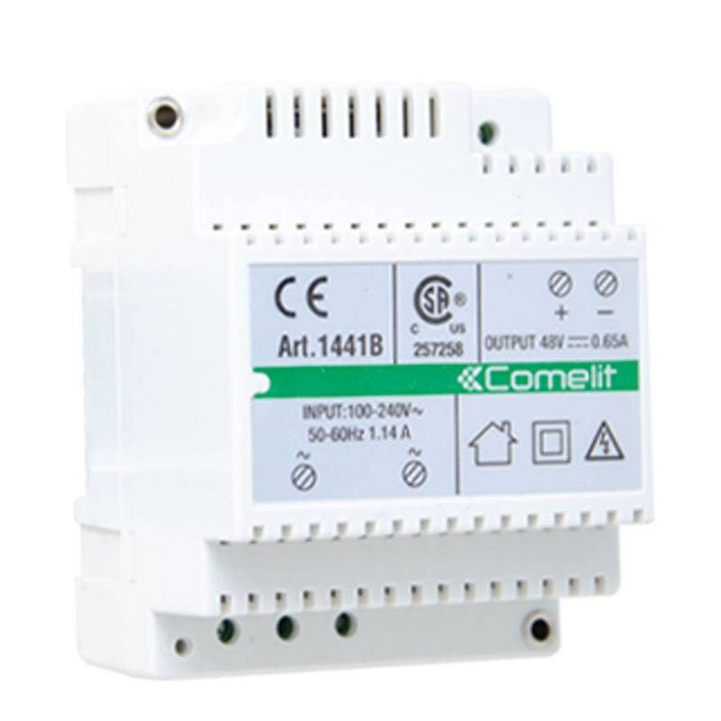 The Comelit power supply is a device designed to provide stable and efficient power supply to ViP video door phone systems. With a 48Vdc output and 30W power, it provides reliability and safety for powering systems. The 4-module DIN format makes it easy to install in electrical panels.