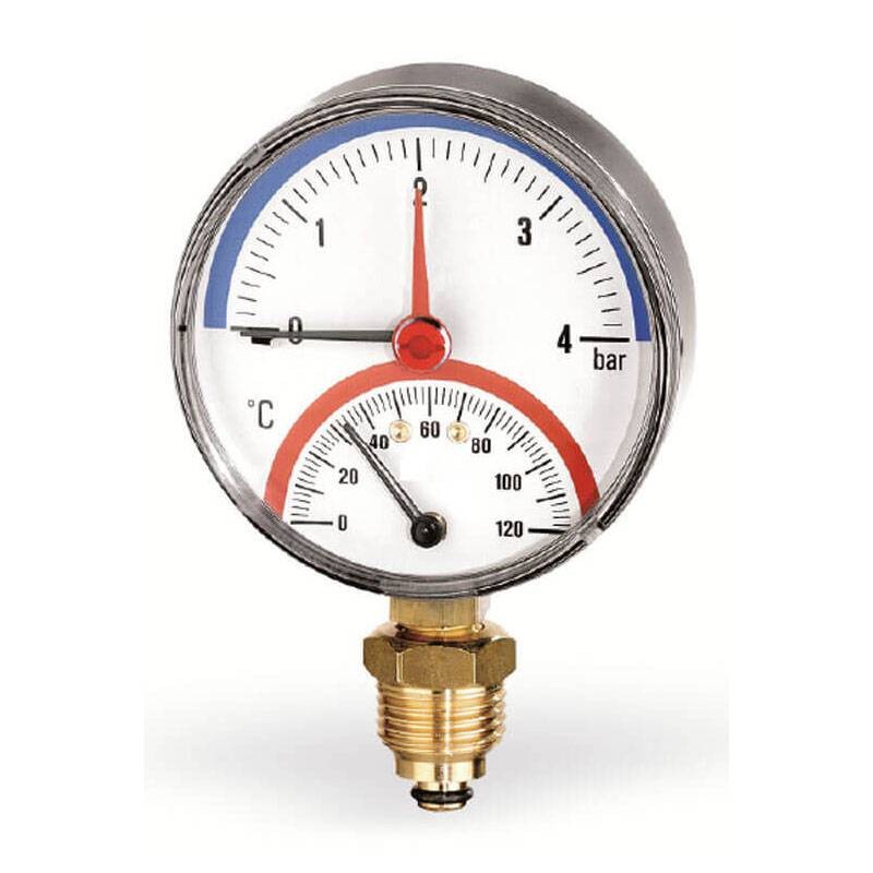 The Watts TIRM-ABS 80 thermomanometer is designed to simultaneously monitor pressure and temperature in heating systems. The graduated scale from 0 to 4 bar and 0 to 120°C allows precise control, ensuring proper operation of systems.
