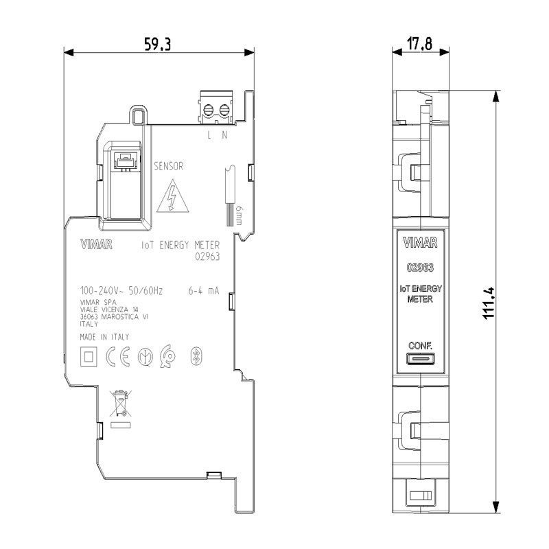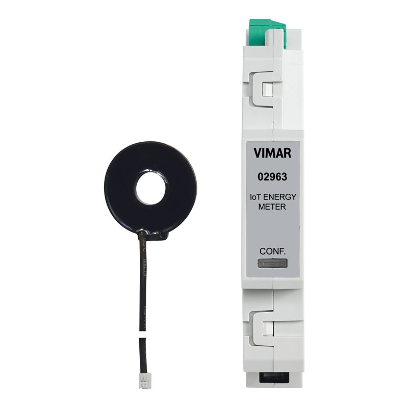 Vimar IOT single-phase connected energy meter for measuring instantaneous and historical electricity consumption and production (with hourly, daily, monthly, yearly resolution):