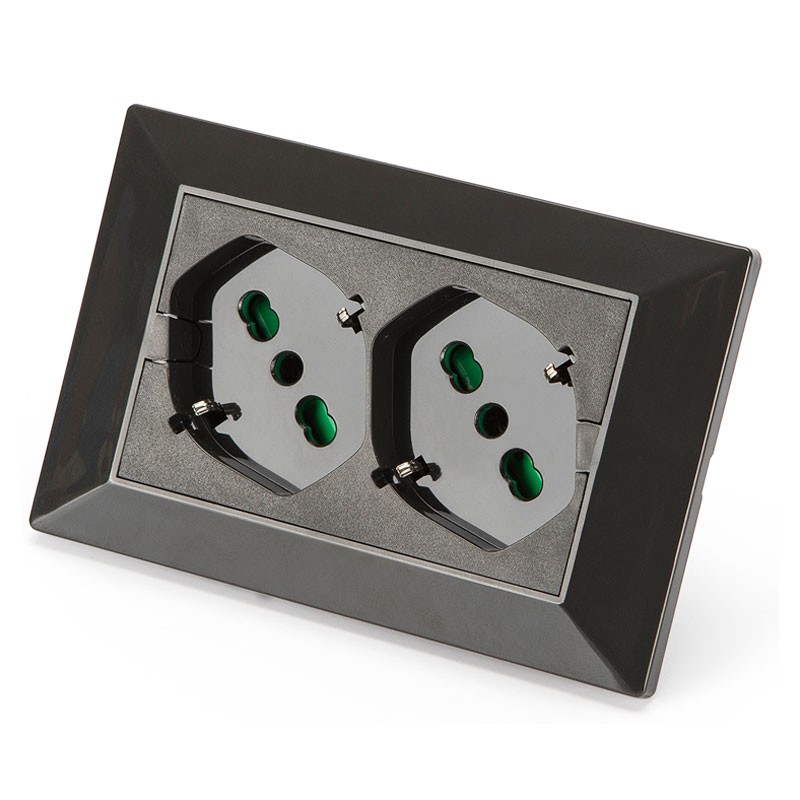 Fanton Opera recessed socket-outlet with 2 Italian/German double sockets 2P+E 16A, 3 Modules, direct mounting on the box (example 503E) without using the supports, the plate is fixed to the recessed box without adding further accessories. Colour anthracite grey.