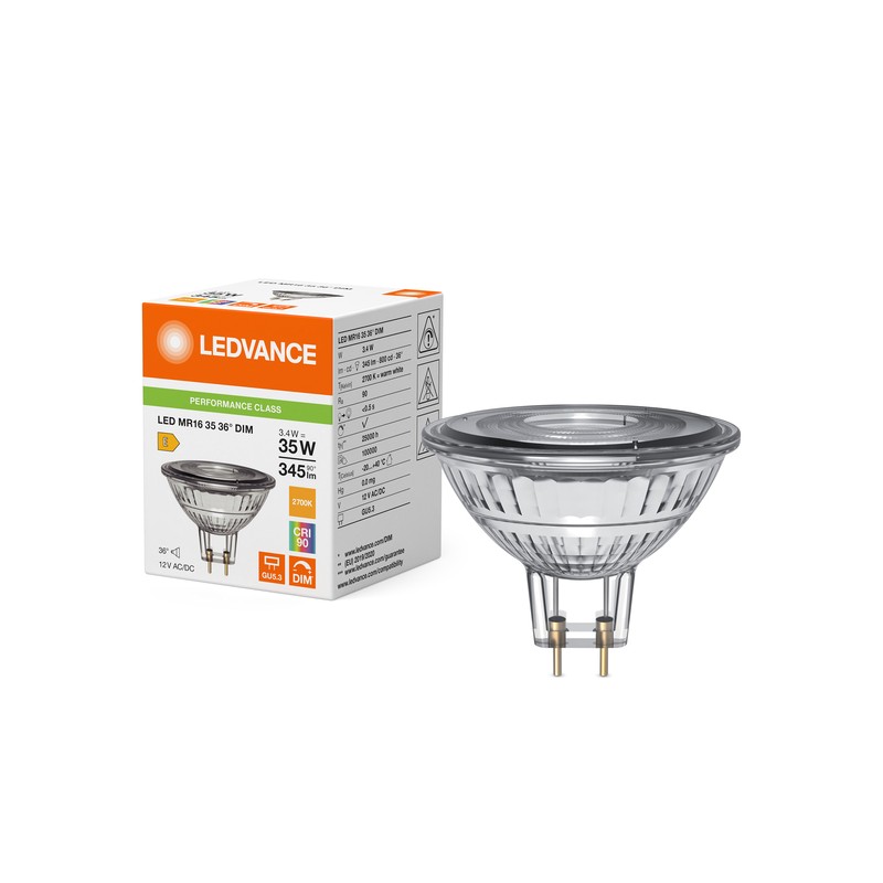 The Ledvance Osram MR16 35 36° DIM dichroic LED bulb is a valid LED alternative to traditional low voltage halogen lamps. Thanks to the reduced consumption of only 3.4 W, it effectively replaces a 35 W lamp, ensuring significant energy savings without compromising on light quality.