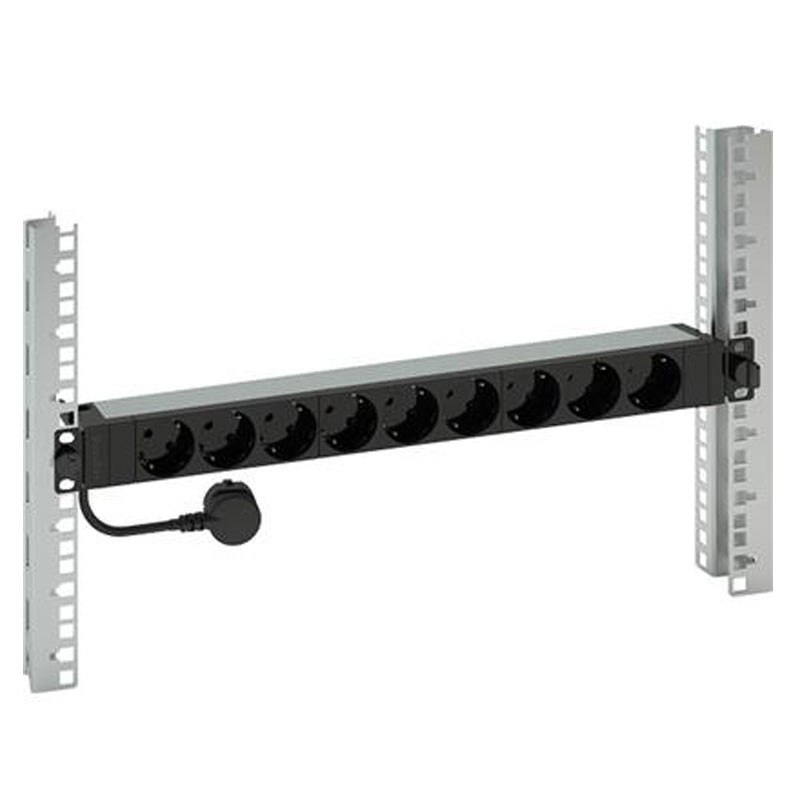 Bticino power block with 9 German two-pole sockets, 3-meter cable and PUSH TO FIX quick fastening. Ideal for powering active equipment in racks, with the following features: