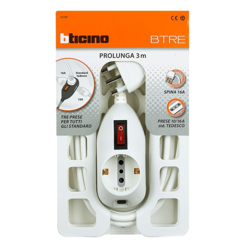 Bticino extension cord 3 mt plug 16A 2 sockets 10/16A 1 schuko 3633DB