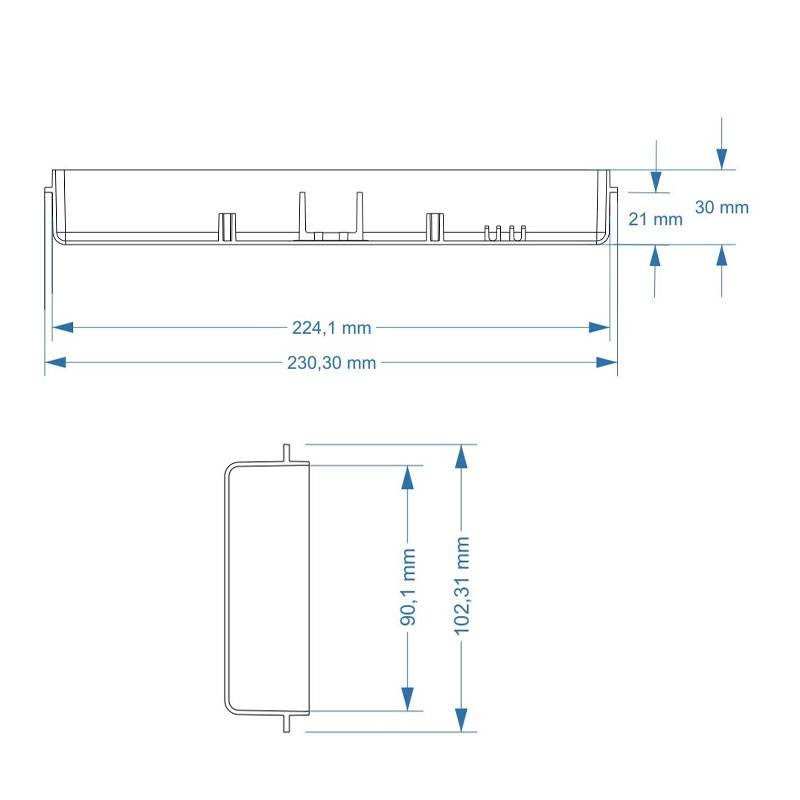 Internal dimensions: 224.1 x 90.1 mm. External dimensions: 230.3x102.3 mm.