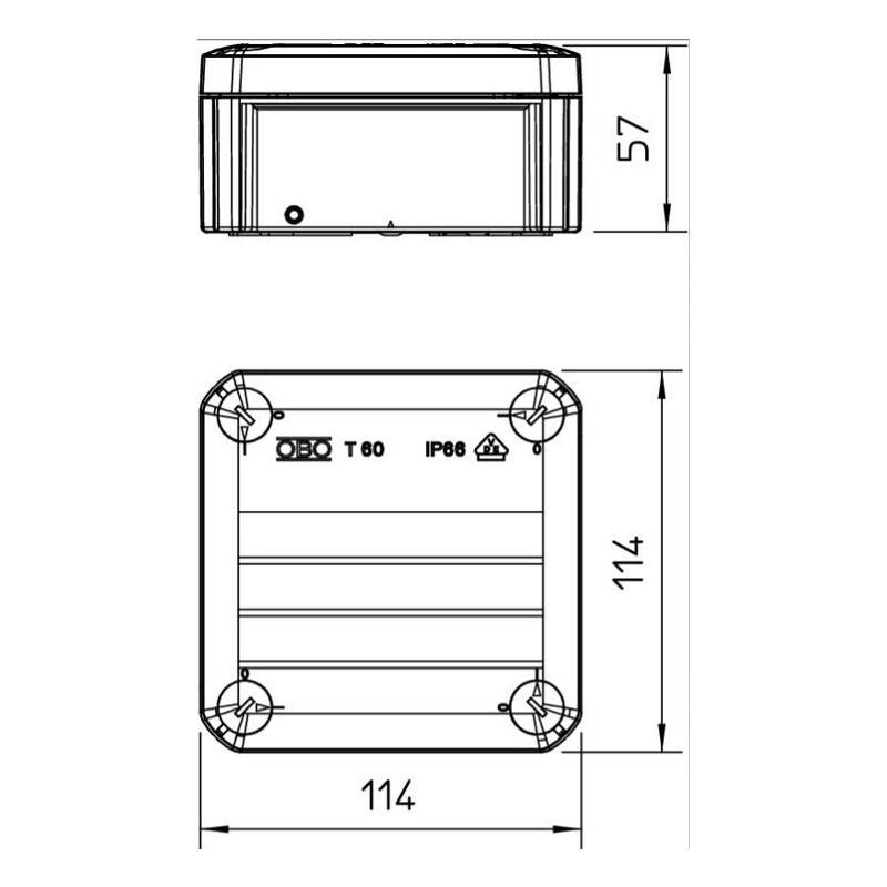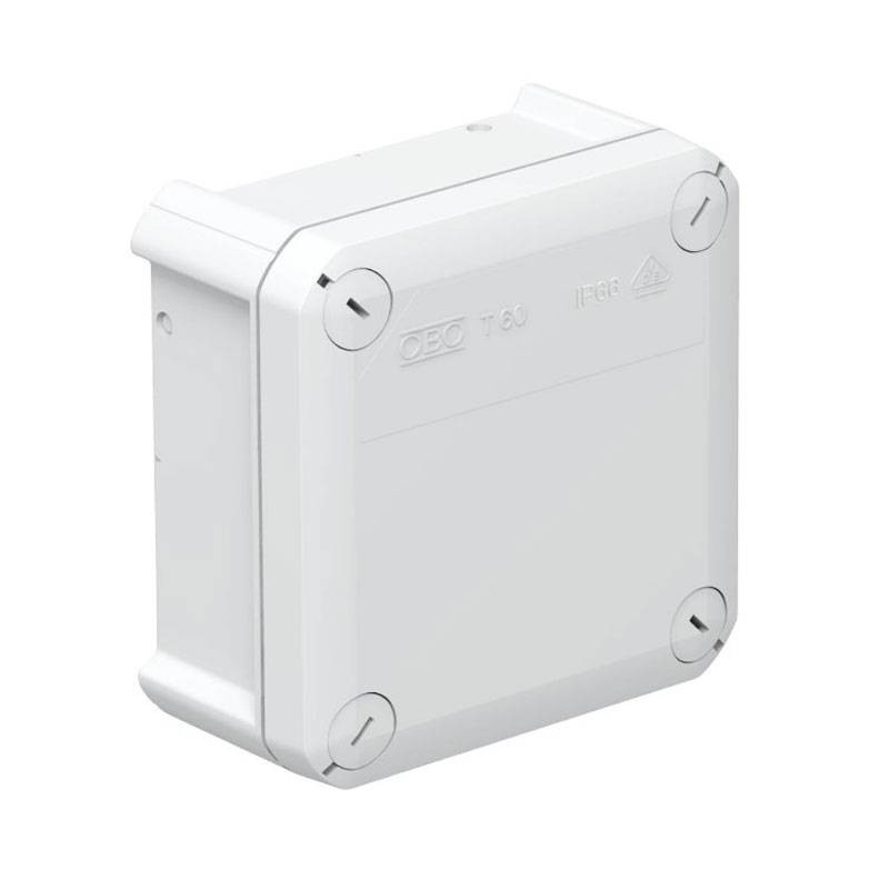 Junction box for connecting cables and lines in indoor and protected outdoor environments. Square shape without entrances. Suitable for wall and ceiling mounting and mounting on mounting plates. With the possibility of internal fixing and mounting on corner sections. Lid with quick closure, plumbable. Constructed of halogen-free materials. Junction box in accordance with DIN EN 60670. Flame-retardant to DIN EN 60695-2-11, test temperature 650 °C. Impact resistance IK08 in accordance with DIN EN 50102.