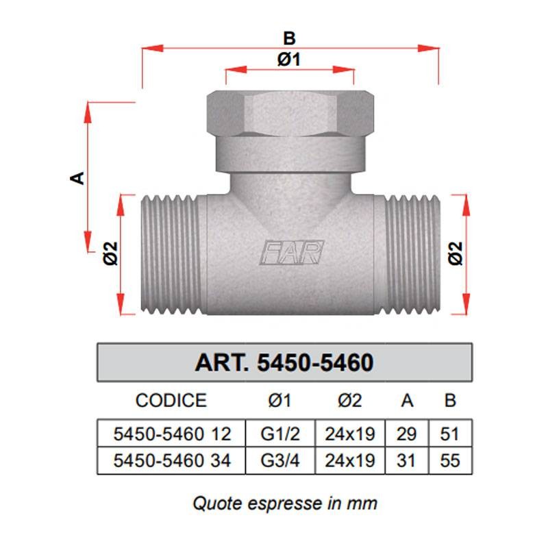 Far T-fitting 1/2" F with 2 monocones chrome-plated 5460 12