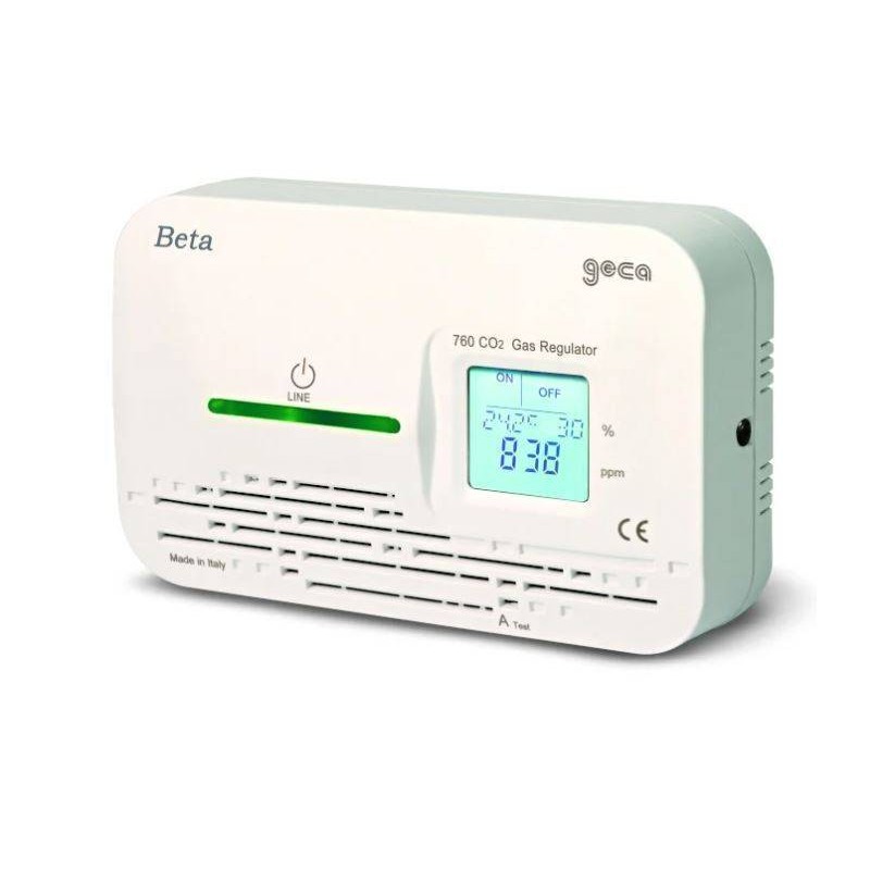 Geca Beta 760 CO2 Carbon Dioxide detector, measures CO2, temperature and humidity, with integrated display, ideal for continuous monitoring of indoor air quality.