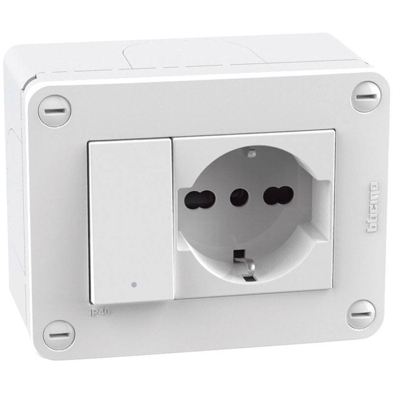 Bticino MatixGO 3 modules IP40 box with switch and schuko outlet white 28403W2