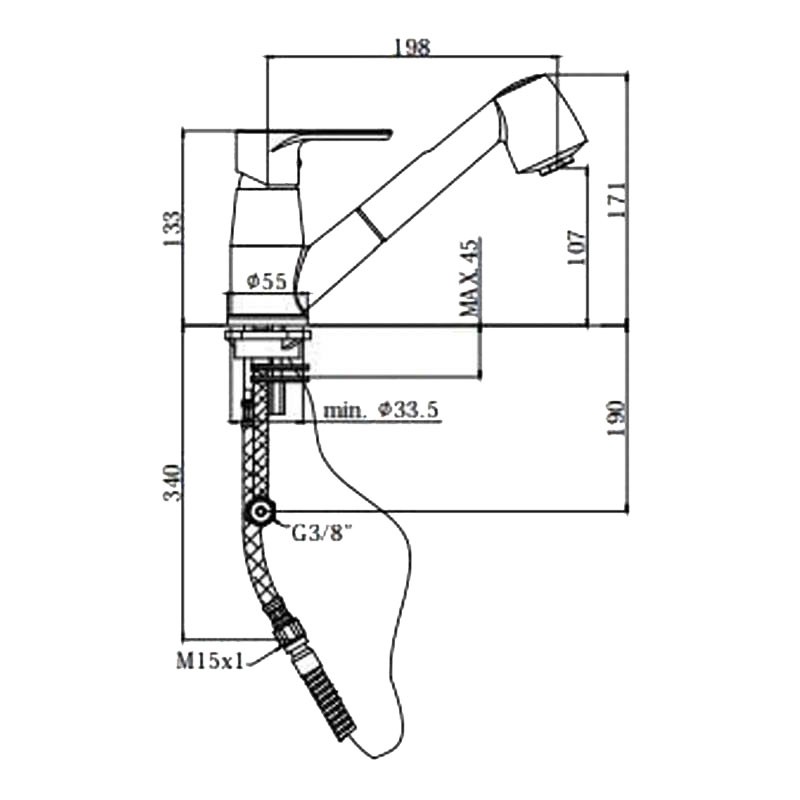 Composed of: Ø35 mm ceramic disc cartridge swivel cast spout with M24x1 aerator set of 2 stainless steel 3/8 "G flexible hoses.