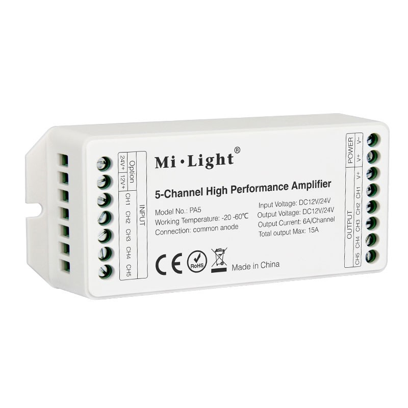 Nobile 15A signal amplifier with 5 channels for control unit code 5920/RGB, 5930/RGBW, 5940/U and 5950/TW.