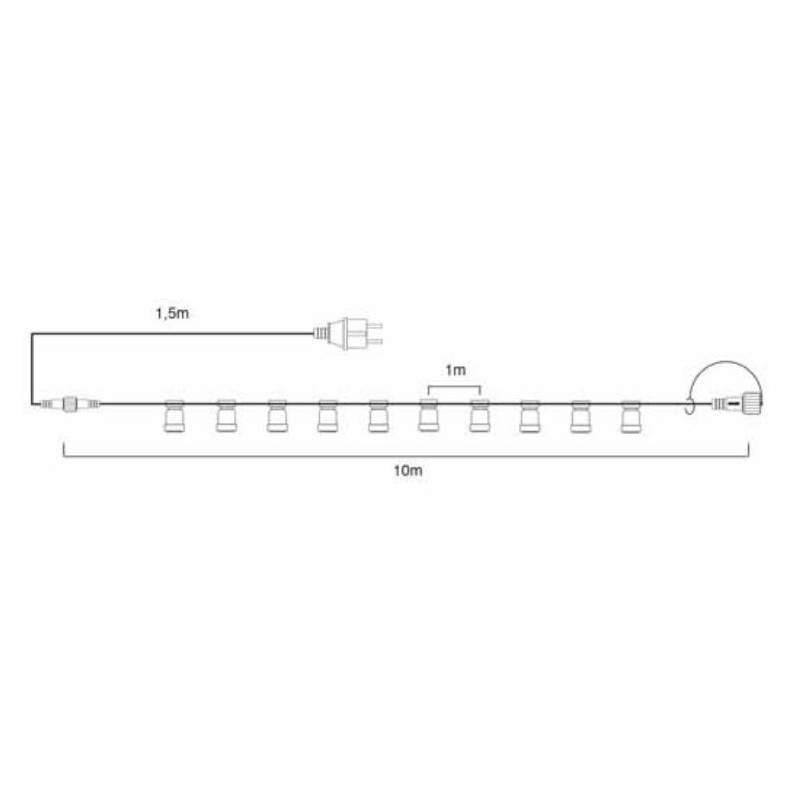 The Wimex Festoon Light Chain 10 E27 lamp holders is designed for outdoor light decorations. With a total length of 11.5 meters and an IP44 rating, it is ideal for events, outdoor environments and parties, providing strength, safety and elegance:
