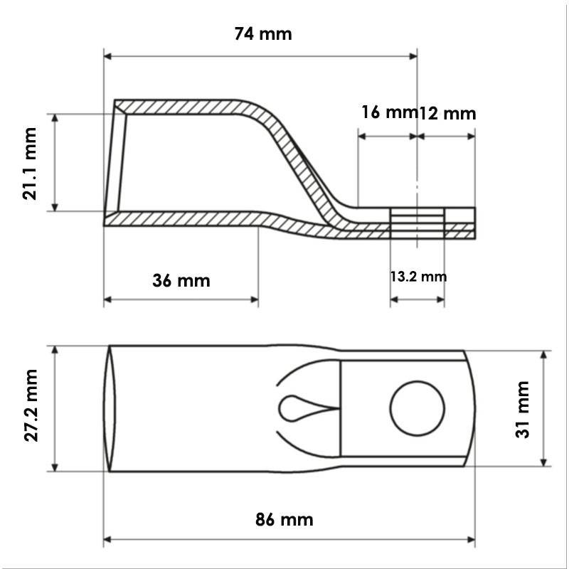 Made from annealed electrolytic copper of more than 99.9% purity, the lug provides excellent conductivity and mechanical strength. Tin plating protects the terminal from oxidation, improving durability even in high humidity or contaminant environments.