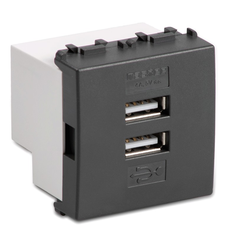 Dual USB power supply 4A Master Modo, 2 modules color gray. It is the most powerful of the Master range, allows charging devices that support it. The total power of 4A is divided between the two sockets when both are in use.