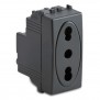 The Modo 2P+E 10/16A two-pin socket is a bivalent electrical outlet suitable for use with 10A and 16A Italian plugs, offering maximum versatility in a single module. Part of the Master Modo series, it features a compact and modern design with a dark gray finish that fits perfectly in both residential and professional environments.