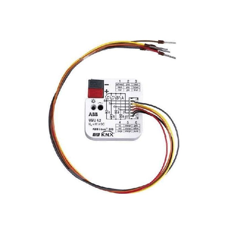 The universal interface has 2 channels that can be set as inputs or outputs. Switches, conventional pushbuttons, auxiliary contacts, LEDs and electronic relays can be used with these devices to realize a wide variety of applications. The maximum length of the connection cables to the inputs is 10 m. The scanning voltage and the power supply for the LEDs (max 2 mA) are provided directly by the device.