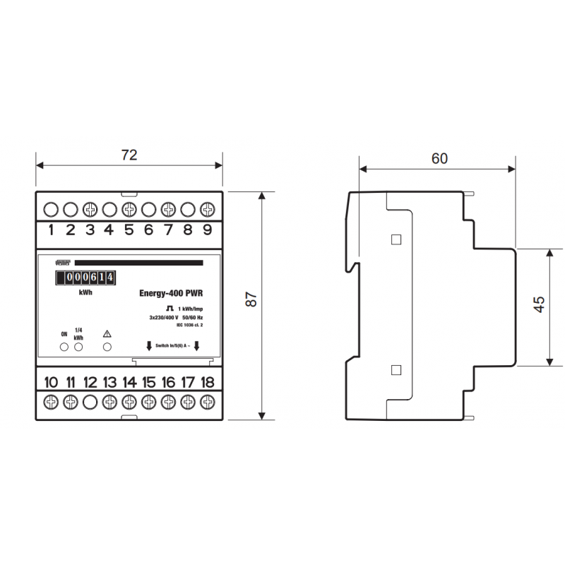 - Suitable for displaying active energy consumption in three-phase 400V systems with or without neutral