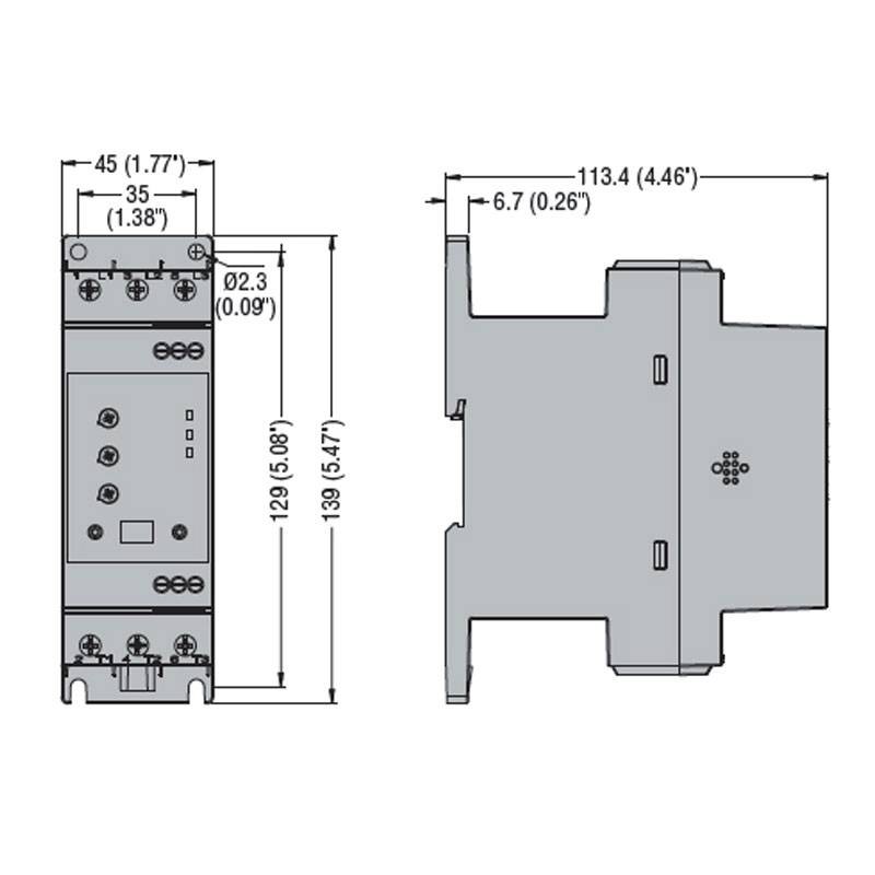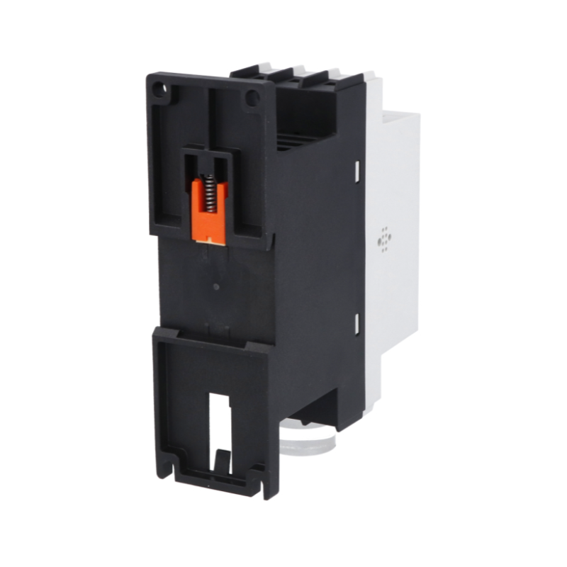 Mounting: ADXN soft starters can be screw-mounted or mounted on 35mm DIN rail (IEC/EN/BS 60715). Screw mounting is achieved by 4 holes on the base of the enclosure, while DIN rail mounting has a rubber insert that prevents the soft starter from sliding on the rail.