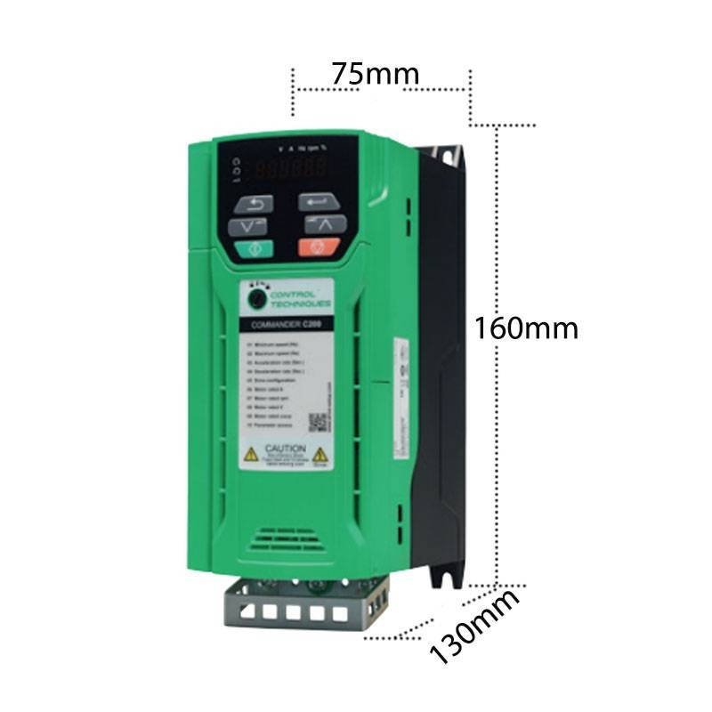 With dimensions 160 × 75 × 130 mm and a weight of 0.75 kg, the Commander C300 is particularly suitable for retrofits and new installations where there is a need to replace an existing drive or add speed control without redesigning the panel. The compact format also aids in dissipation and orderly arrangement of components, especially on compact machines.