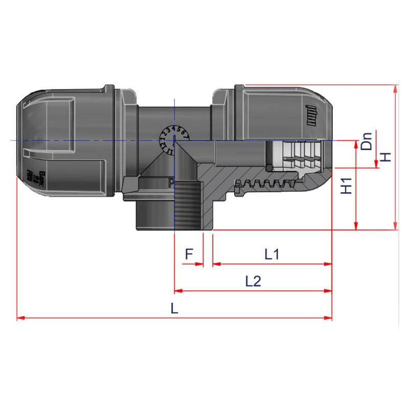 Nupi ELOPRESS 90-degree threaded polyethylene T-Fitting for pipe connection with the following characteristics: