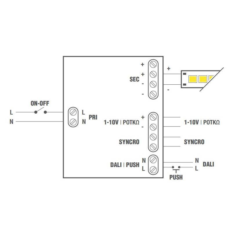 - Brightness adjustment via: push button (PUSH 230Vac), push button (PUSH 24Vdc), DALI signal, 0-10V signal, 1-10V signal, 47Kohm potentiometer
