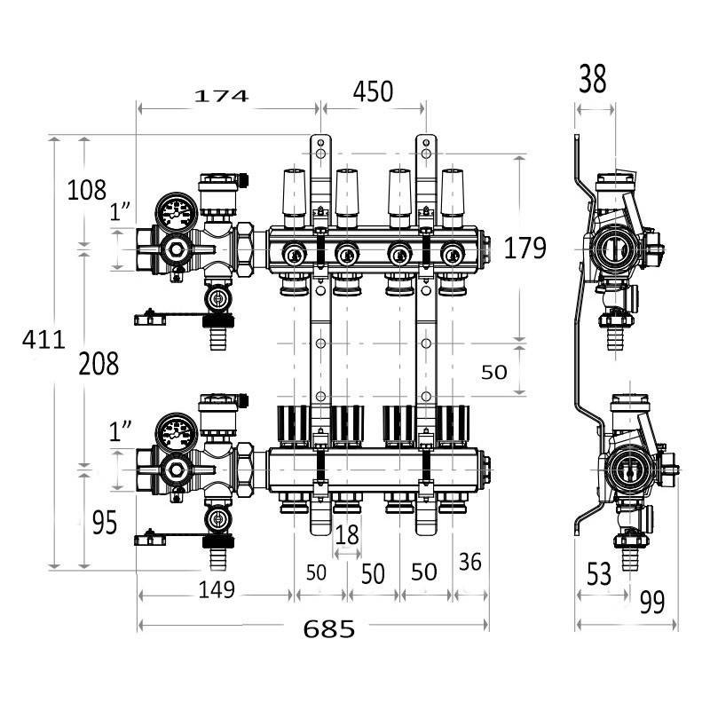 Return manifold includes valves with manual steering wheel, removable for installation of Giacomini R478, R478M, R473, R473M compatible electrothermal actuators for smart control of circuits and temperature.