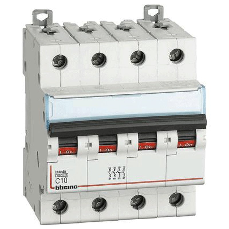 Bticino circuit breaker, 4 modules, DIN connection (universal for any switchboard on the market), poles 4P, 10 amperes, breaking capacity 4.5 kA, voltage 400 Vac, curve C.