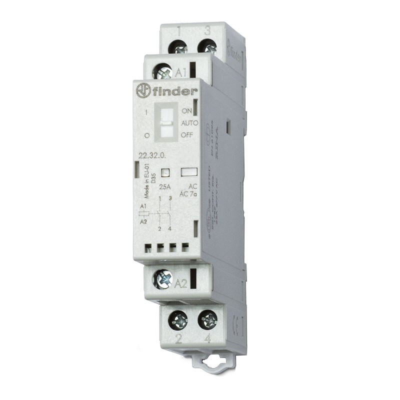 Contactor Finder 25A, contacts 2NO 24VAC/DC 1 Module with screw terminals, for 35mm rail mounting (EN 60715).