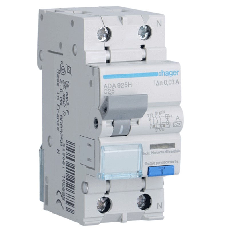 Hager Residual Current Operated Circuit Breaker 1P+N 25A 6kA 30mA Curve C Type A 2M ADA925H