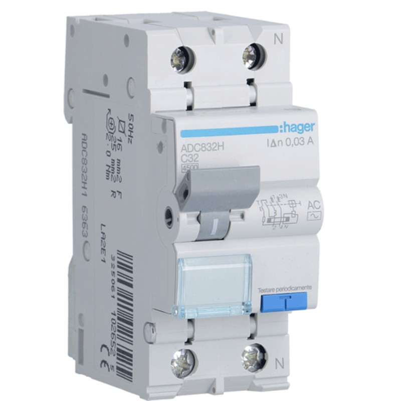 Hager 1P+N 32A 4.5kA 30mA Residual Current Operated Circuit Breaker Curve C Type AC ADC832H