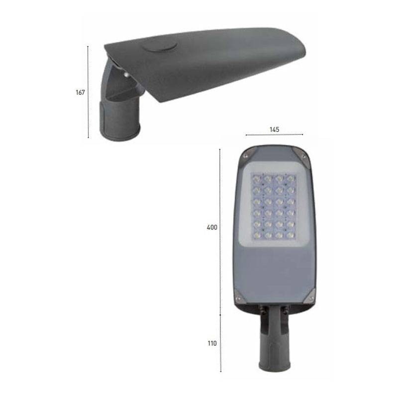 Street lighting fixture adjustable vertical and horizontal adjustable pole head attachment made of die-cast aluminum passivated and painted with high-strength epoxy powder, extra clear tempered glass. stainless steel hardware, salt spray tested, also suitable for use in marine environments. prepared for nema socket and zhaga socket with electrical and mechanical connection between sensor and fixture. lightweight, durable and streamlined body with self-cleaning design.