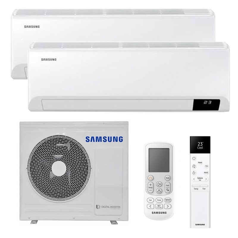 Dual Split Samsung Cebu Wi-Fi 12000+18000 BTU air conditioner,, with Inverter technology and R32 gas, compact and stylish design. Smart management via SmartThings App and voice assistants, air purification and quiet operation.