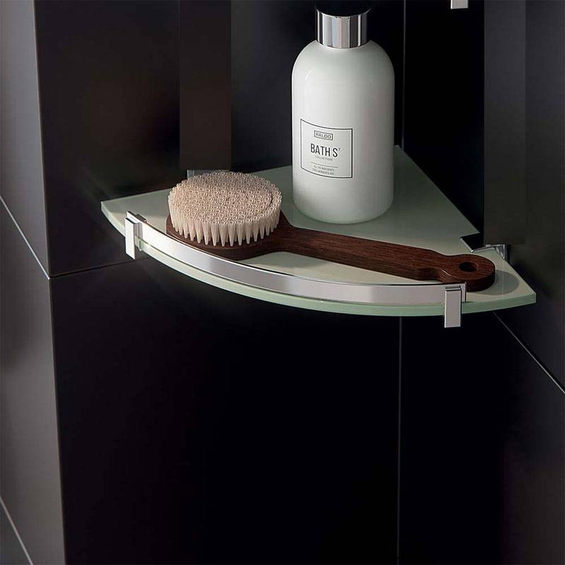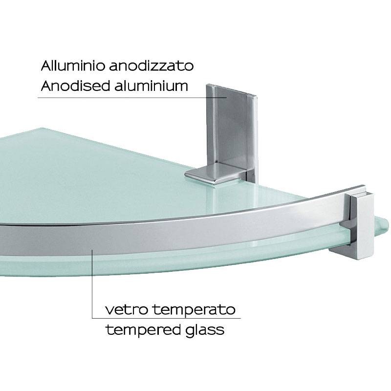 Gedy Cloud shower caddy, corner shape, tempered glass and anodized aluminum material, size 26x26x5.8cm.