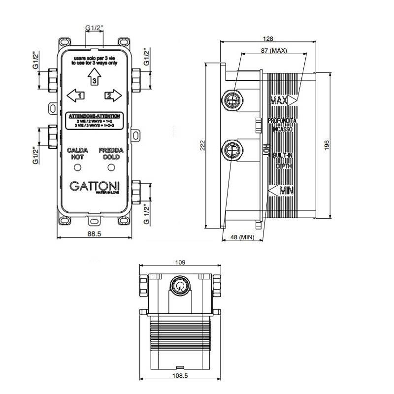 Gattoni Shower Tap Recessed Body is a universal box designed for mechanical mixers with 1- to 3-way diverter outlet, providing maximum versatility for shower systems with shower head, hand shower, and other configurations. Compatible with several Gattoni series, it ensures easy installation and long life due to its sturdy construction, with the following features: