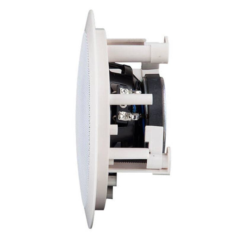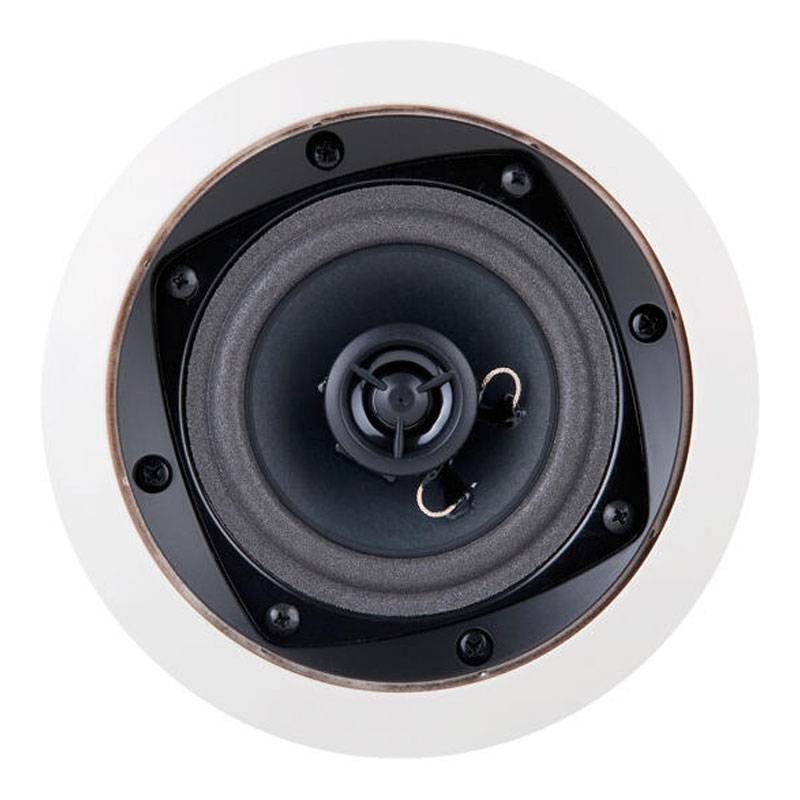 Round in-wall acoustic speaker designed to deliver high sound performance in residential, commercial and professional environments. With its 2-way coaxial configuration of a 10-cm woofer and 1.3-cm tweeter, it delivers clear, detailed and balanced sound reproduction across the entire audio spectrum.