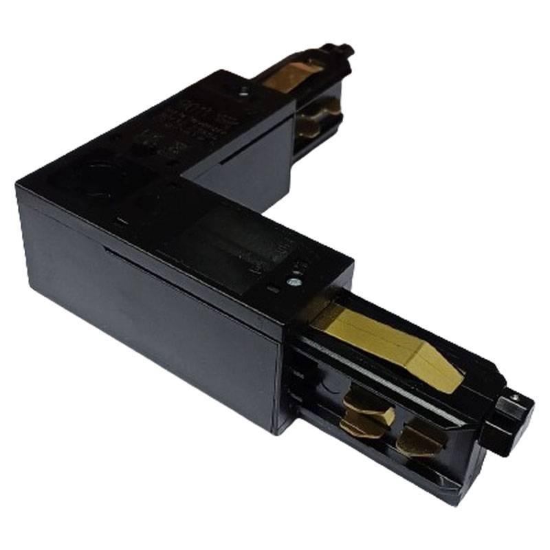 L-joint for Ilmas internal polarity/external ground track, black color, IP20 protection rating, polycarbonate body and copper alloy contacts.