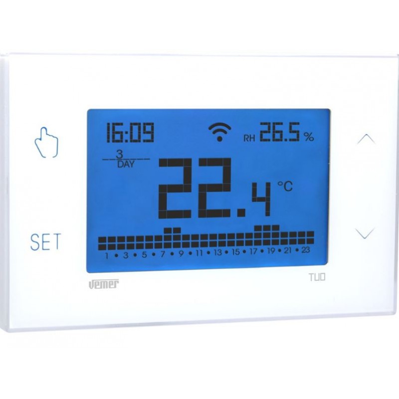 Chronothermostat Touch Screen Wi-Fi Vemer TUO for wall mounting with weekly programming and mains power supply. Thanks to the integrated wi-fi module, the chronothermostat can be managed remotely using the app developed by Vemer and available for iOS and Android smartphones and tablets.