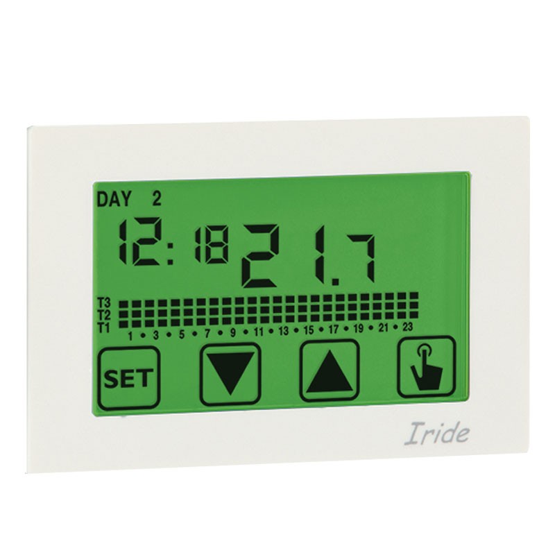 Vemer IRIDE 230 touch screen programmable thermostat. Regulates and programmes the temperature of boilers and air-conditioners, battery powered, compatible with Bticino, Vimar, Gewiss, Ave and ABB, with white and anthracite coloured switches. For tech switches the faceplate must be purchased.