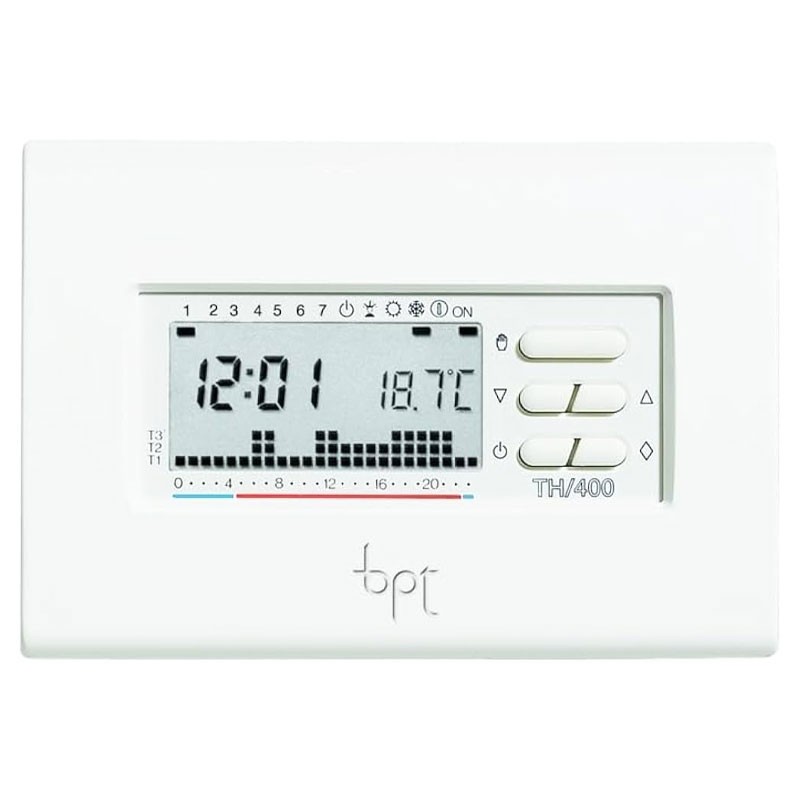 The BPT TH/400 digital chronothermostat is an entry-level device designed to offer precise and reliable temperature control in residential or professional environments. With weekly programming and digital operation, this model allows you to manage climate comfort effectively, adapting to different daily needs.
