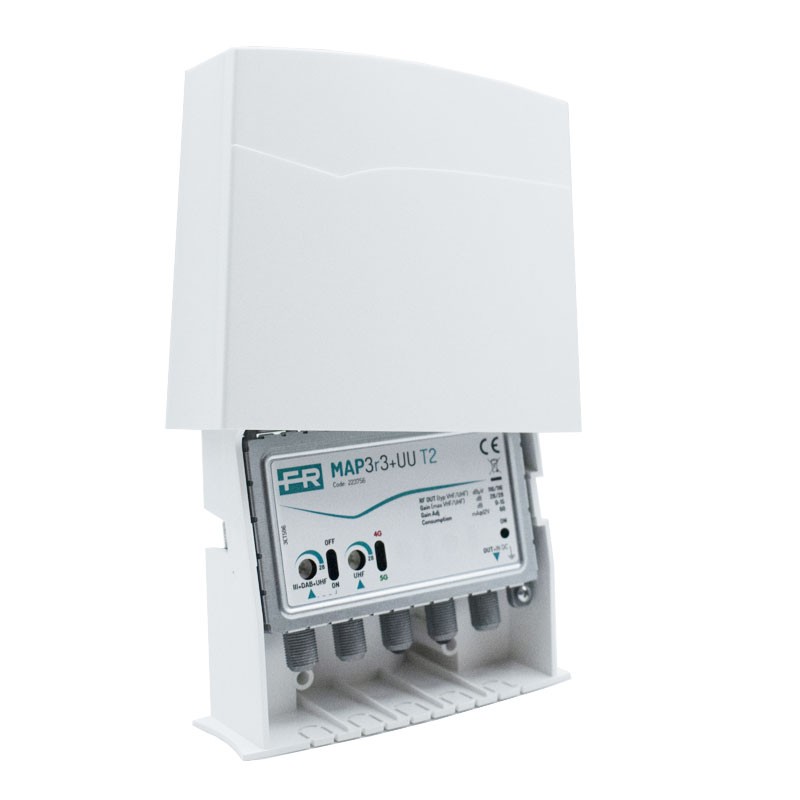 Fracarro 2-Input Pole Amplifier is ideal for optimizing the reception of TV signals in bands III+DAB and UHF, thanks to a high gain of 28 dB for each input and independent adjustment up to 15 dB. Designed with a built-in 5G filter, it ensures an interference-free signal and maximum reliability, with the following features: