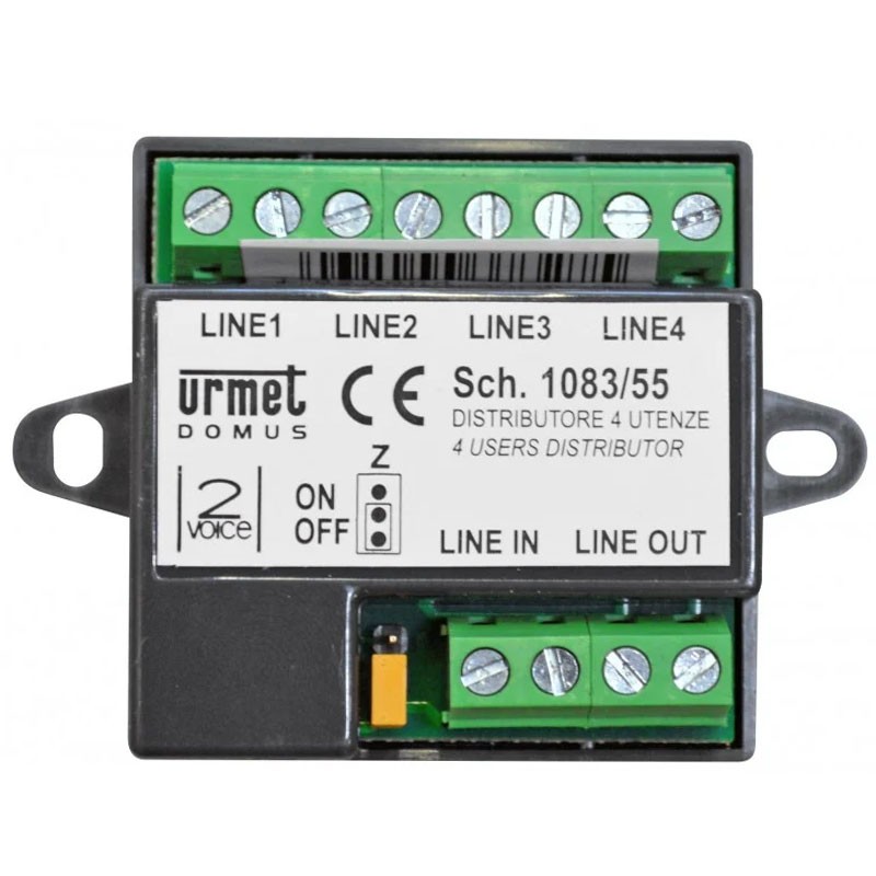 - Urmet 2VOICE 4-user distributor. Connection for input bus, output bus and 4 apartment branches. Equipped with short-circuit protection on outputs. Dimensions 45 x 45 x 16 mm (WxHxD).
