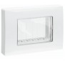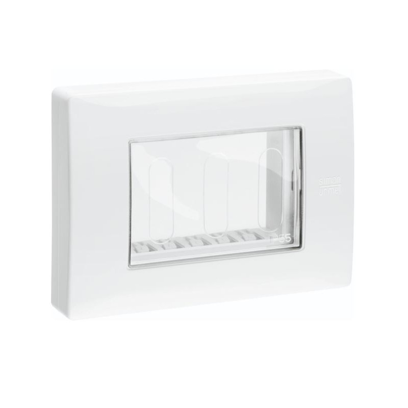 Urmet Simon Nea 3-module wall housing, colour nea white, glossy finish. Degree of protection IP55. Any Urmet Simon Nea series module can be installed inside. Type of installation: Recessed in 3-module box.