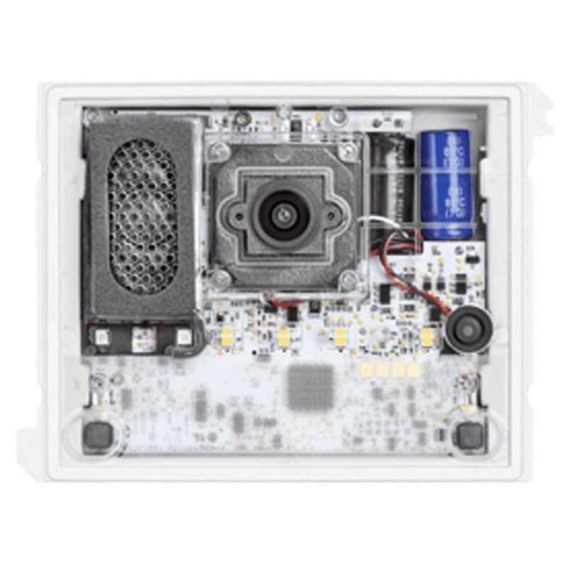 Audio/video unit on Alpha push-button panel for 2Voice system. Equipped with wide-angle camera, LED lighting with brightness sensor, loudspeaker and microphone. Signaling of the system status by 3 leds. Local programming or via smartphone/tablet/PC. Management of 2 electric locks: pedestrian and driveway.