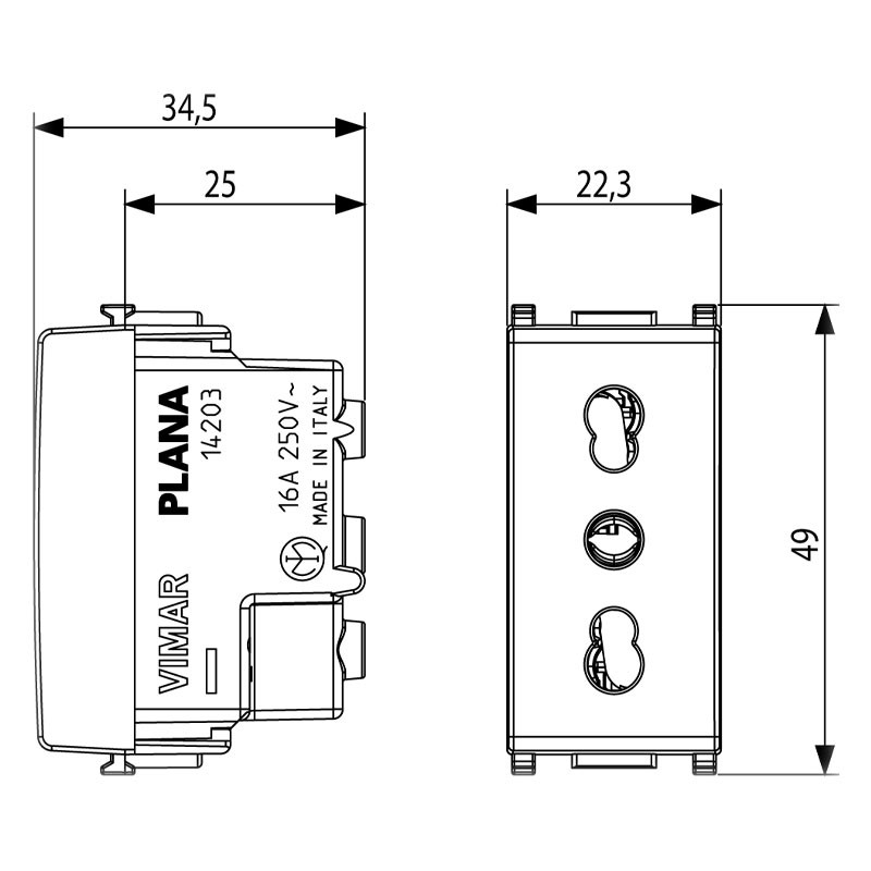 Vimar Plana two-pin socket, safety, compatibility and reliability in a glossy white flush-mounted module with the following features: